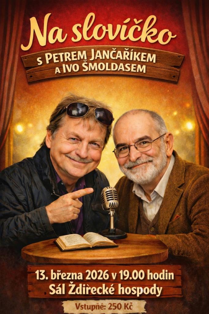 V pátek 13. března se od 19.00 hodin ve Ždírecké hospodě uskuteční první akce související s oslavami výročí naší obce. Povídání s panem Petrem Jančaříkem bude nejen o jeho krátkém působení ve škole na Žďáře. Jako host pana Jančaříka vystoupí pan PhDr. Ivo Šmoldas. Předprodej vstupenek bude zahájen 9.2.2026 telefonicky nebo osobně zakoupením vstupenky v kanceláři OÚ. Do 22.2.2026 je předprodej rezervován pouze pro naše občany. Pro ostatní zájemce bude předprodej spuštěn 23.2.2026. Cena vstupného je 250,- Kč.